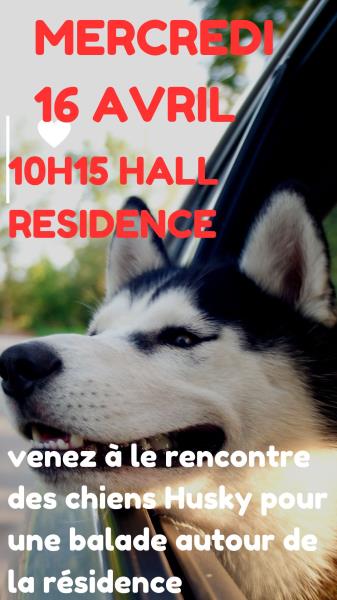 La résidence est heureuse de vous annoncer le retour des chiens de Husky le mercredi 16 avril à partir de 10h dans les jardins de la Résidence. Julien viendra accompagné de ces 8 chiens pour proposer aux résidents une promenade dans les jardins pour tous, les personnes en mobilité réduite pourront également participer en étant tirer par les chiens comme dans un vrai traineau.